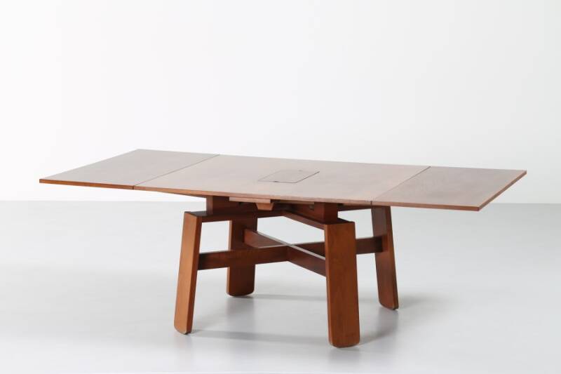 Tavolo da pranzo in noce, laminato e acciaio, Bernini (metà '60). Di notevole ingegno è il meccanismo che permette alla parte centrale del tavolo di alzarsi, dotata di un vassoio mobile in acciaio